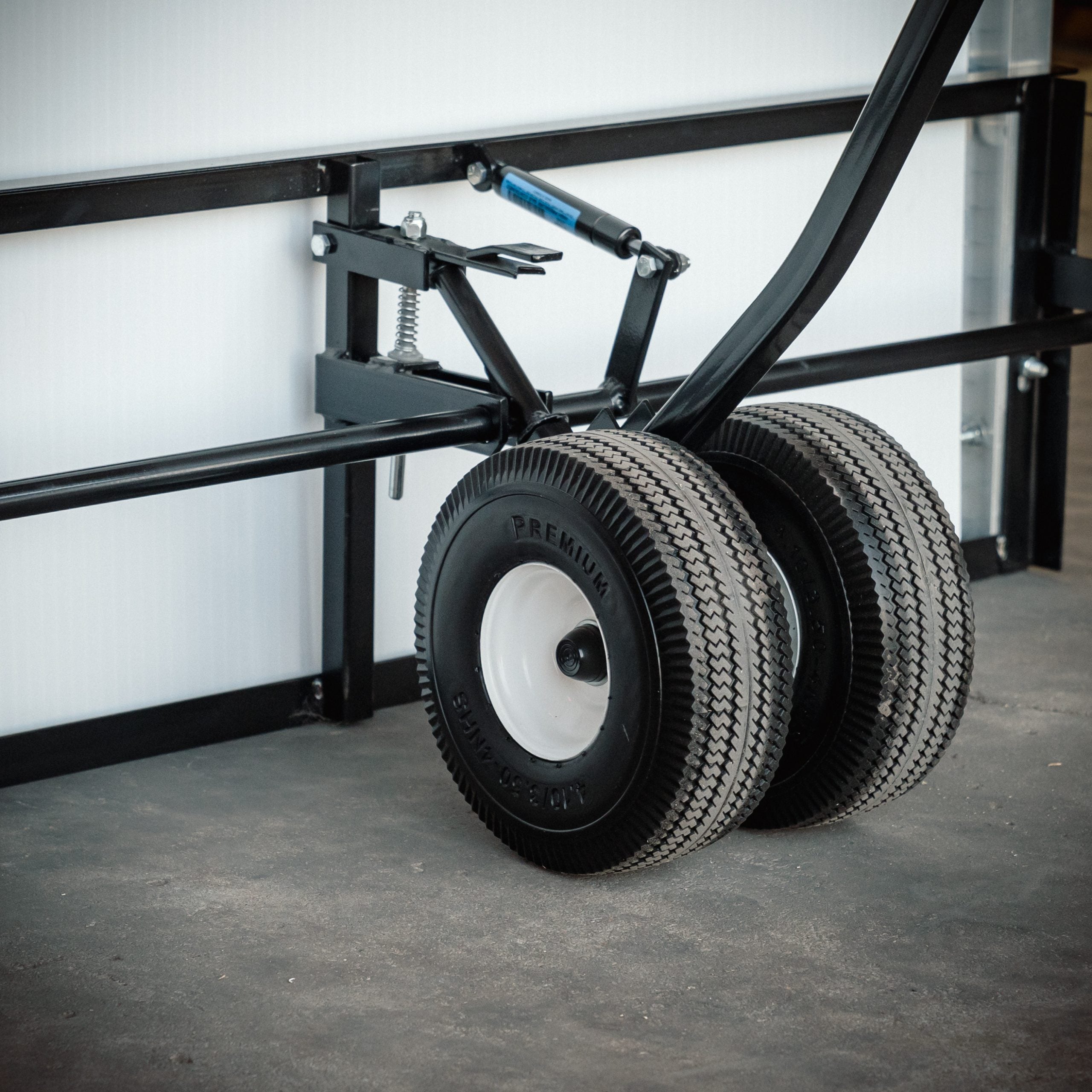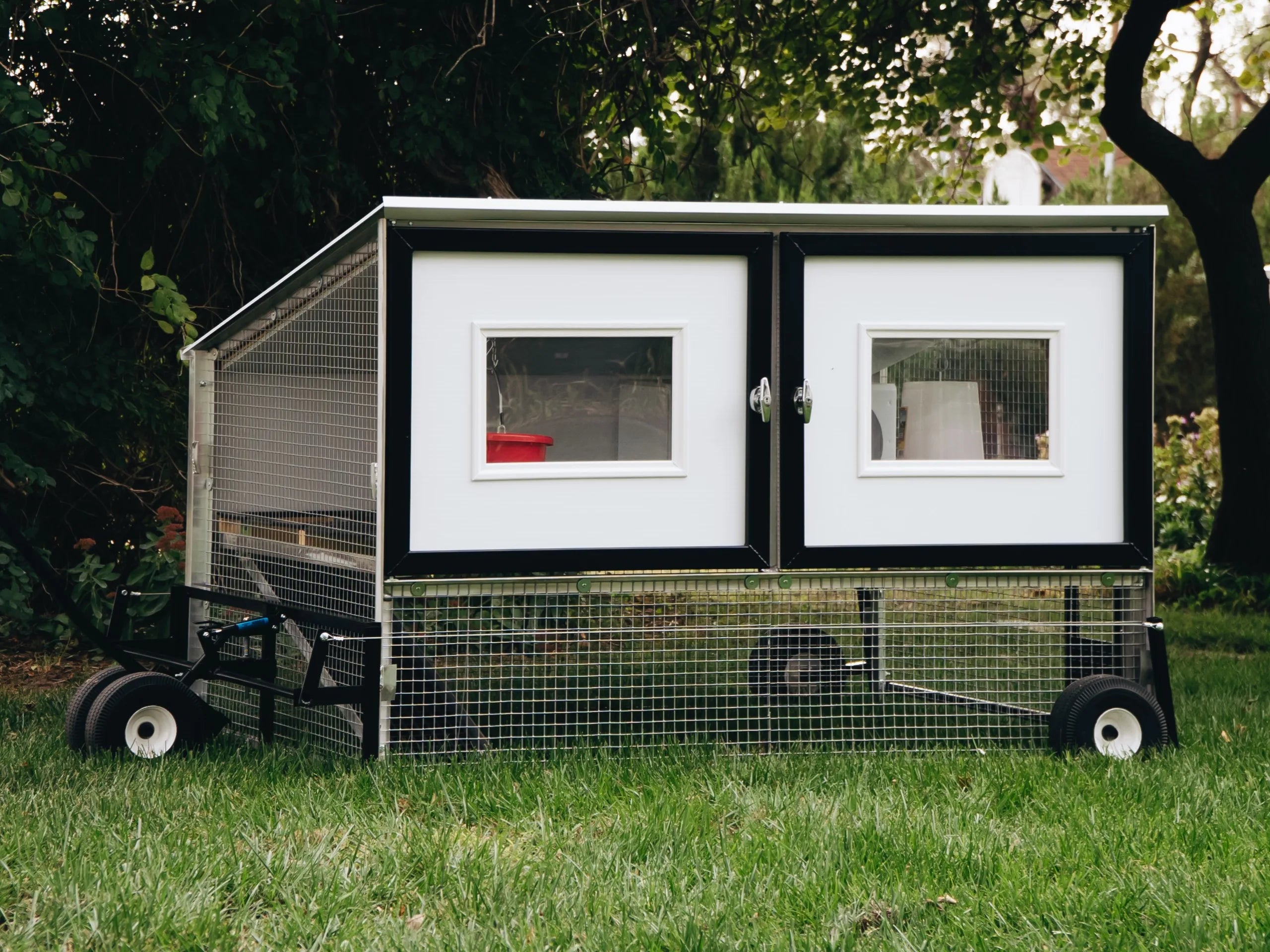 EZ-lift system for easy movement—The Egg Cart’n Classic raises onto four wheels, latches in place, and rolls easily over grass. The EZ-lift system sets the Egg Cart’n apart from other chicken tractors of similar size. Foam-filled tires ensure you’ll never have a flat.