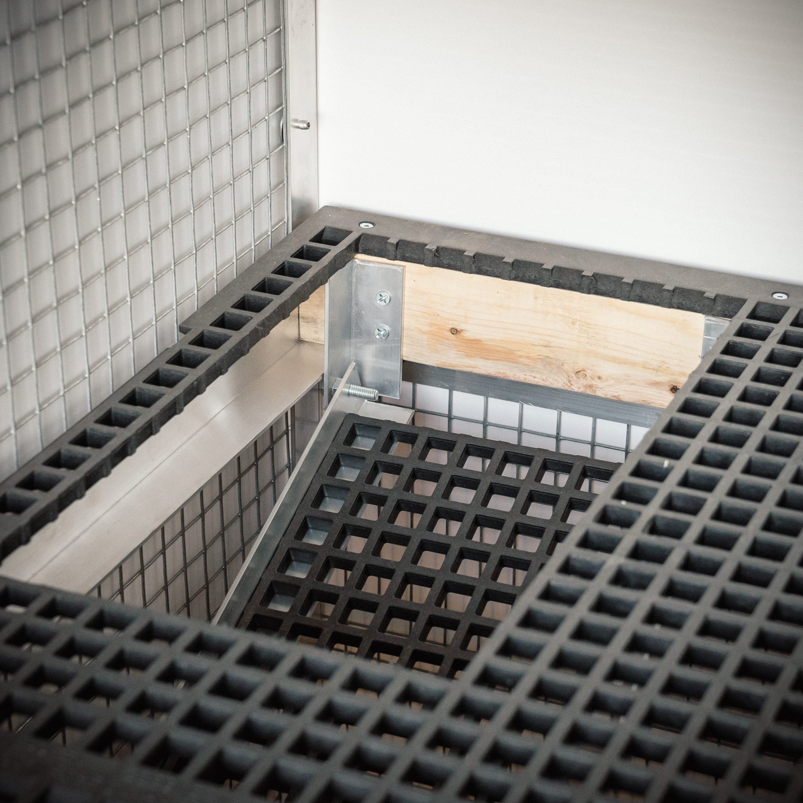 The feeder and watering bucket hang conveniently from the dedicated hanging brackets.