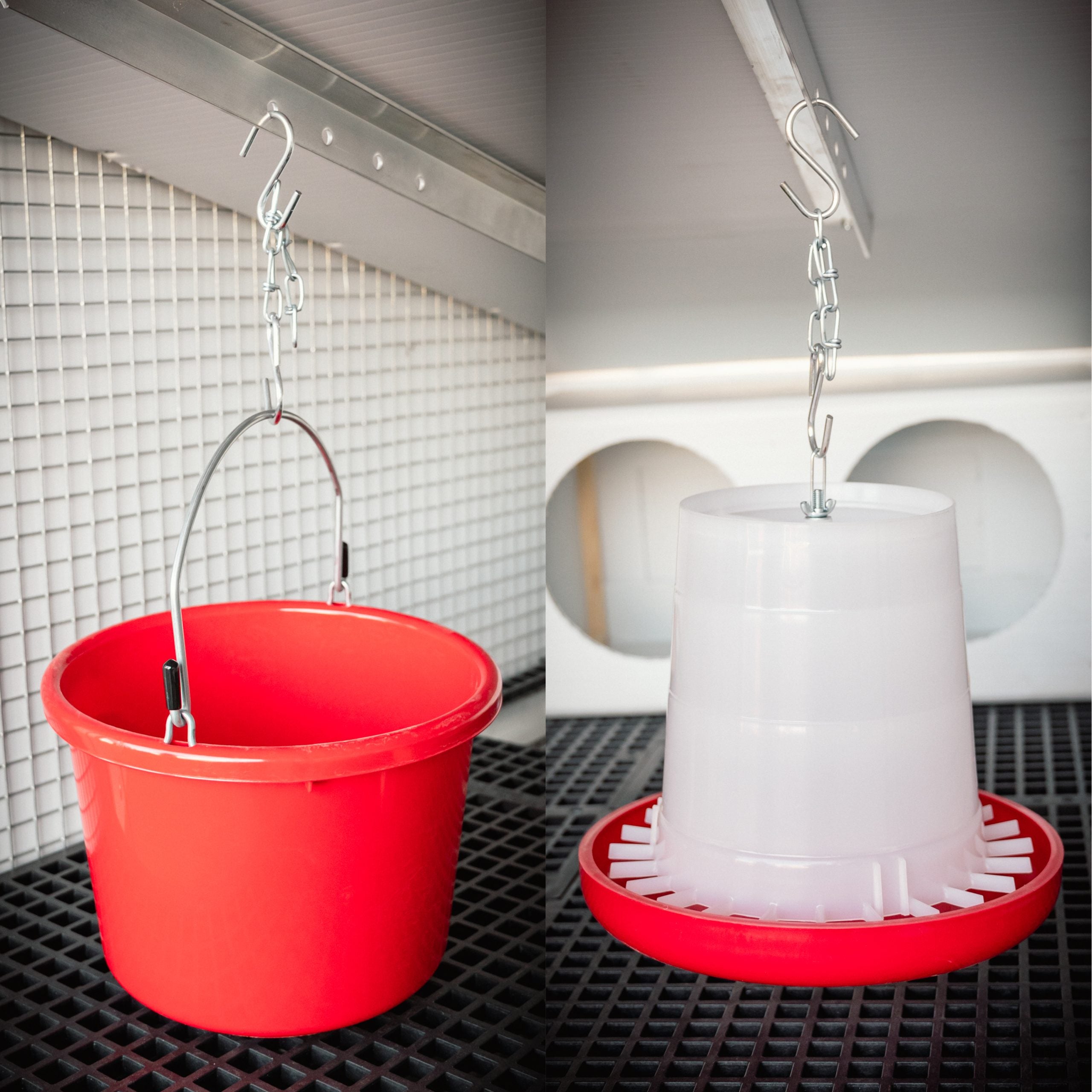 The Egg Cart’n is ingeniously designed to make watering and feeding convenient and stress-free. The Egg Cart’n includes two brackets on the ceiling —one for hanging the included feeder and the other for hanging the included watering bucket.
